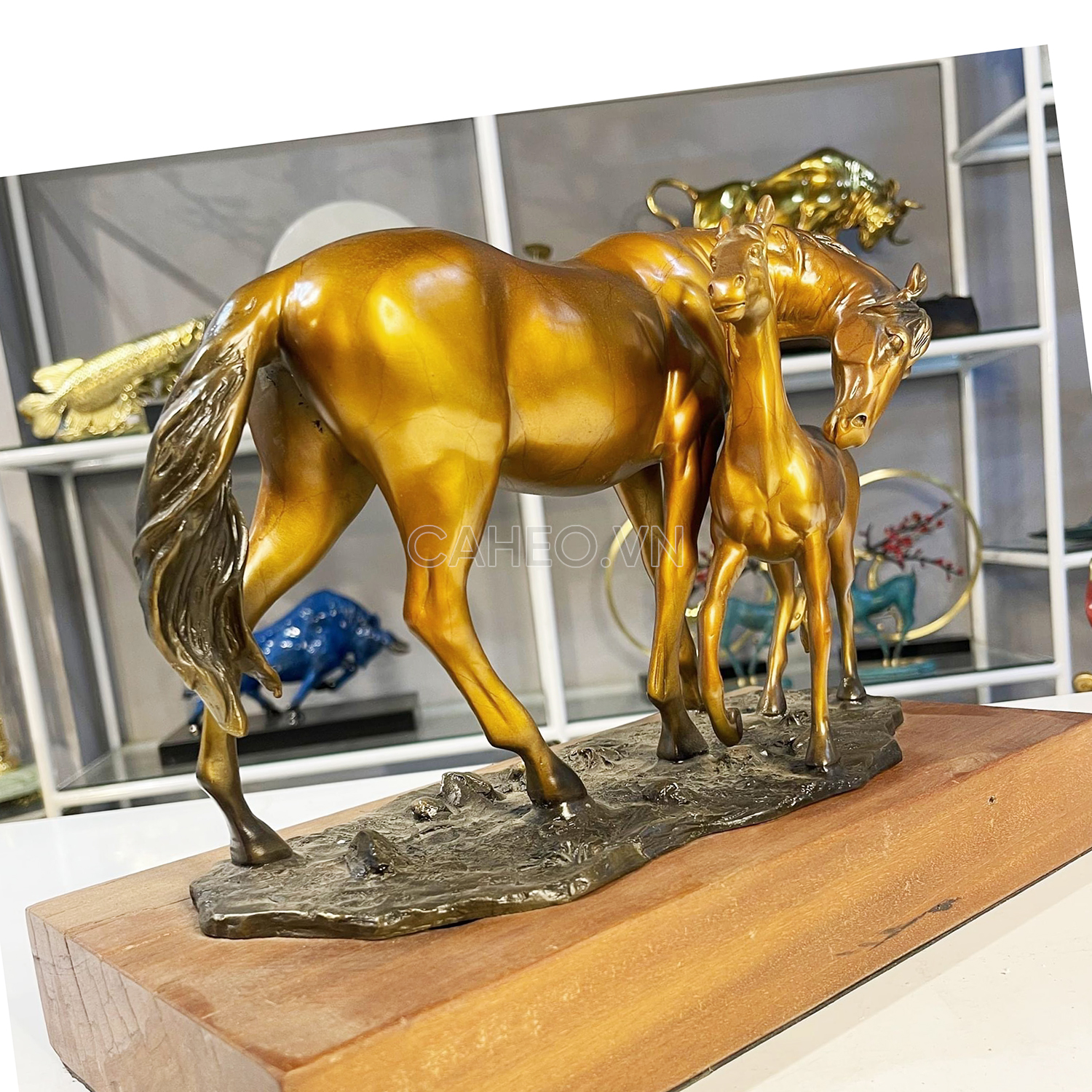 • Tượng đồng Ngựa mẹ con : Khắc họa hình ảnh Ngựa mẹ âu yếm Ngựa con, có ý nghĩa tình mẫu tử thiêng liêng, hình ảnh Ngựa mẹ sinh Ngựa con còn mang ý nghĩa "Sự nghiệp đạt thành quả" trong kinh doanh. Ngoài ra, tượng đồng đôi ngựa còn có công dụng phong thủy hóa giải sát khí từ sao Nhị Hắc (một sao thuộc hành Thổ, hung – đem lại vận xui, sa sút và bệnh tật).